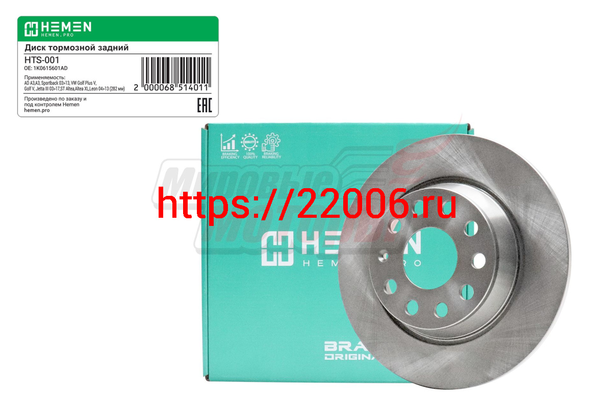 - Диск тормозной задний Audi A3 03>13, VW Golf V, Jetta III 03>17,Seat Altea, диам. 282 мм(HTS001) в Богдановиче недорого